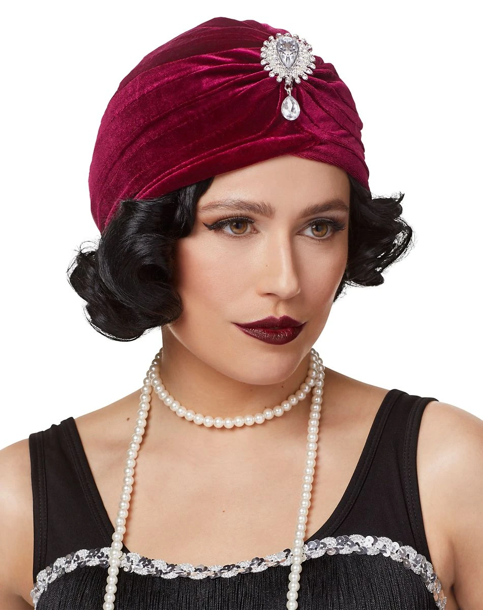 Pair this lavish ’20s Burgundy Gem Turban Head Wrap with a little black dress and a long strand of pearls for a stunning vintage look. This rich burgundy head wrap features a sparkling gem accent and soft, lush fabric.