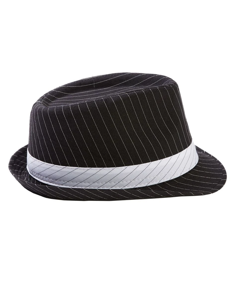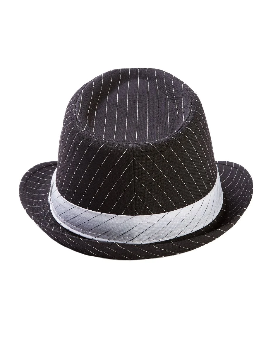 Be a true gangster with this ’20s Pinstripe Hat! As if you are emerging from the Roaring Twenties, this black pinstriped hat with white band around the base will be the perfect accent to any costume!