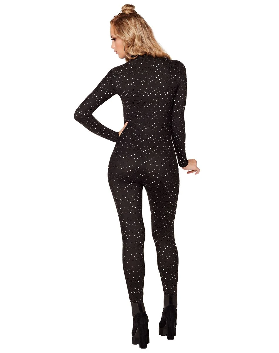 Get ready to SHINE! This black zip-up catsuit is adorned with light-catching rhinestones. With long sleeves and pants, this form-fitting catsuit adds comfortable coverage and stunning sparkle to your look from head to toe.