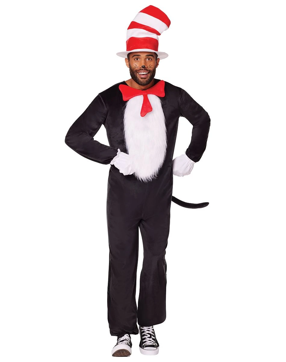 Make sure you leave enough time to create some rhymes when you dress in the officially licensed Adult Cat in the Hat costume. This black and white jumpsuit features a red bow at the neck and comes complete with gloves and oversized red and white top hat.
