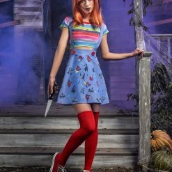 Embrace your mischievous side in this officially licensed Chucky costume! A striped t shirt, printed overall skirt, and fiery red wig put a flirty twist on Chucky’s classic look.