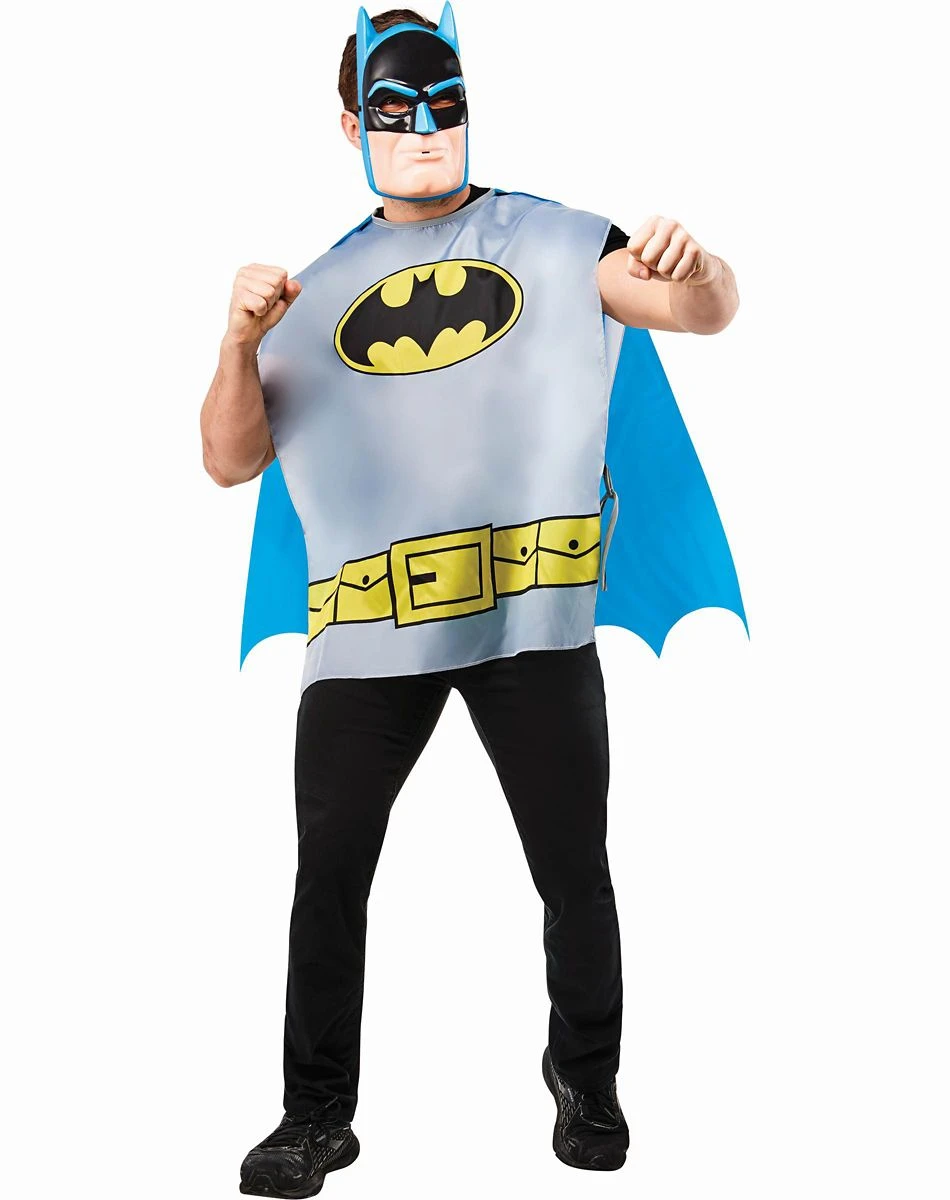 Take down the villains of Gotham with this Adult Classic Batman Costume Kit! This officially licensed costume kit, which includes a classic Batman half mask and tabard costume top, will have you looking straight out of your favorite comic book. Head out with the rest of the Justice League and put crime to rest!