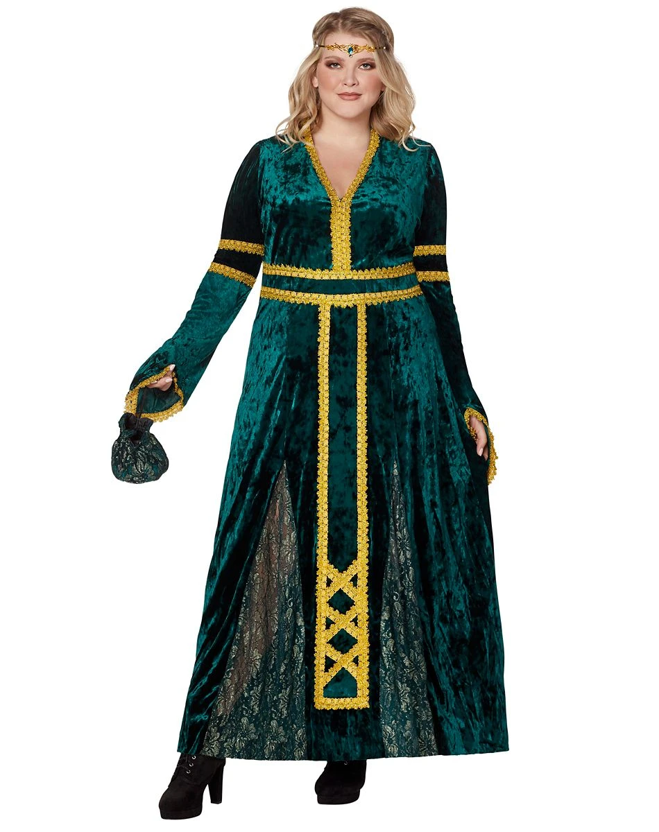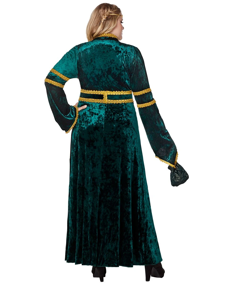Command the attention of all who stand before you in this Adult Emerald Lady Plus Size Costume! With stunning green velour and rich gold accents, this costume will make you the fairest lady in the kingdom. Finish the opulent look with a matching emerald headpiece and coin purse!