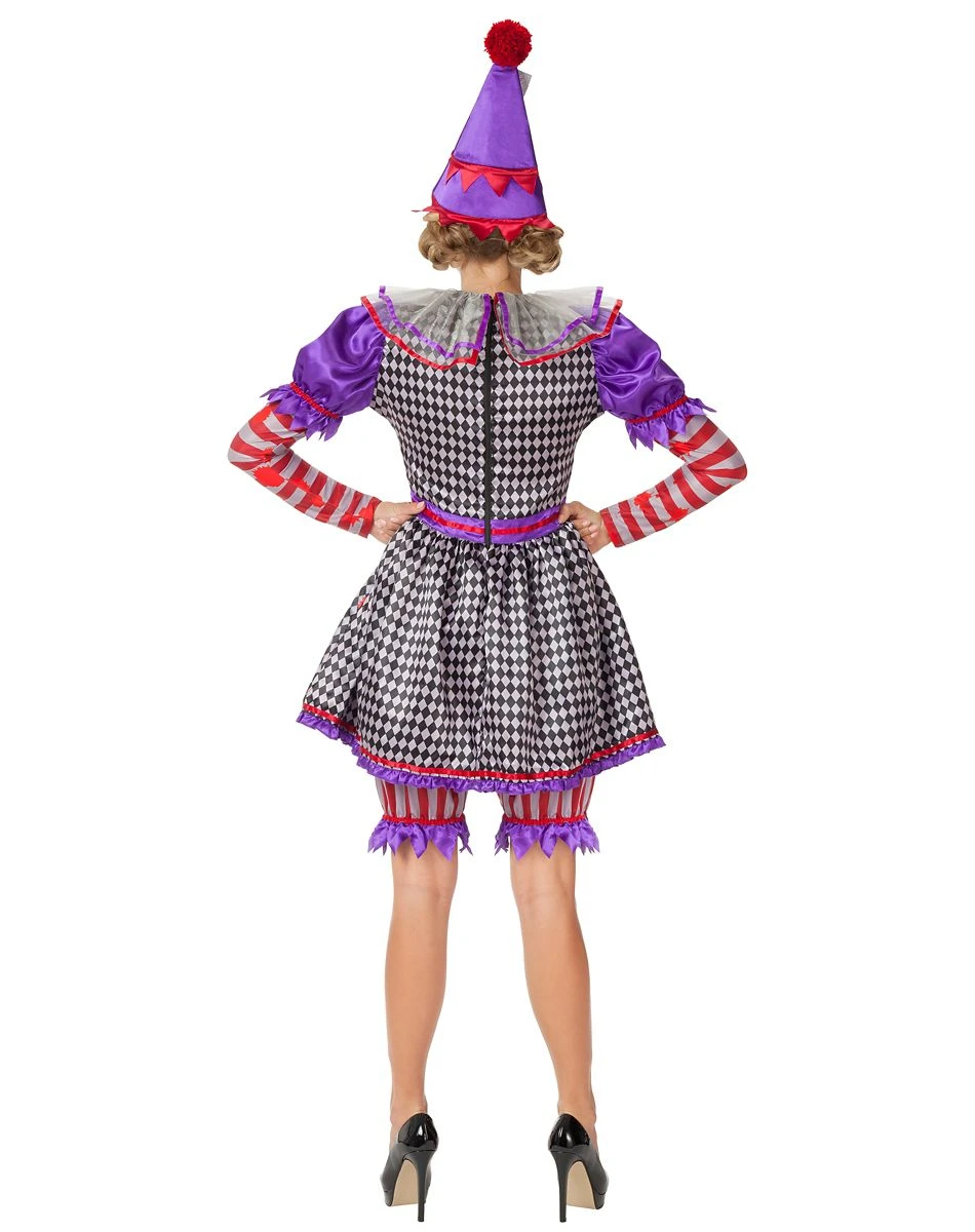 Slice your way into a frighteningly fun Halloween with this killer clown costume! Straight from the circus comes this creepy ensemble, featuring a black and white dress (detailed with purple frills, red polka dots, and red poms), red and white striped sleeves, and a matching pom-topped hat. Add some clown makeup to complete your creepy clown costume!