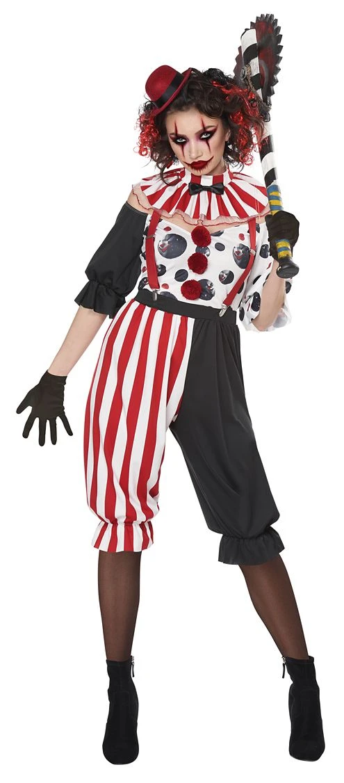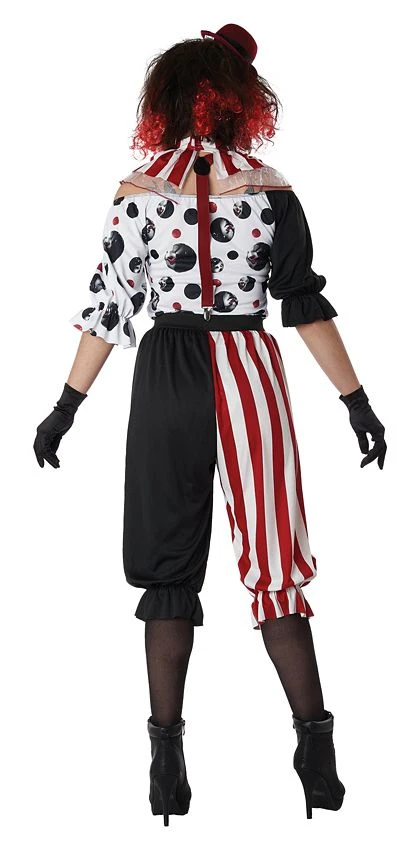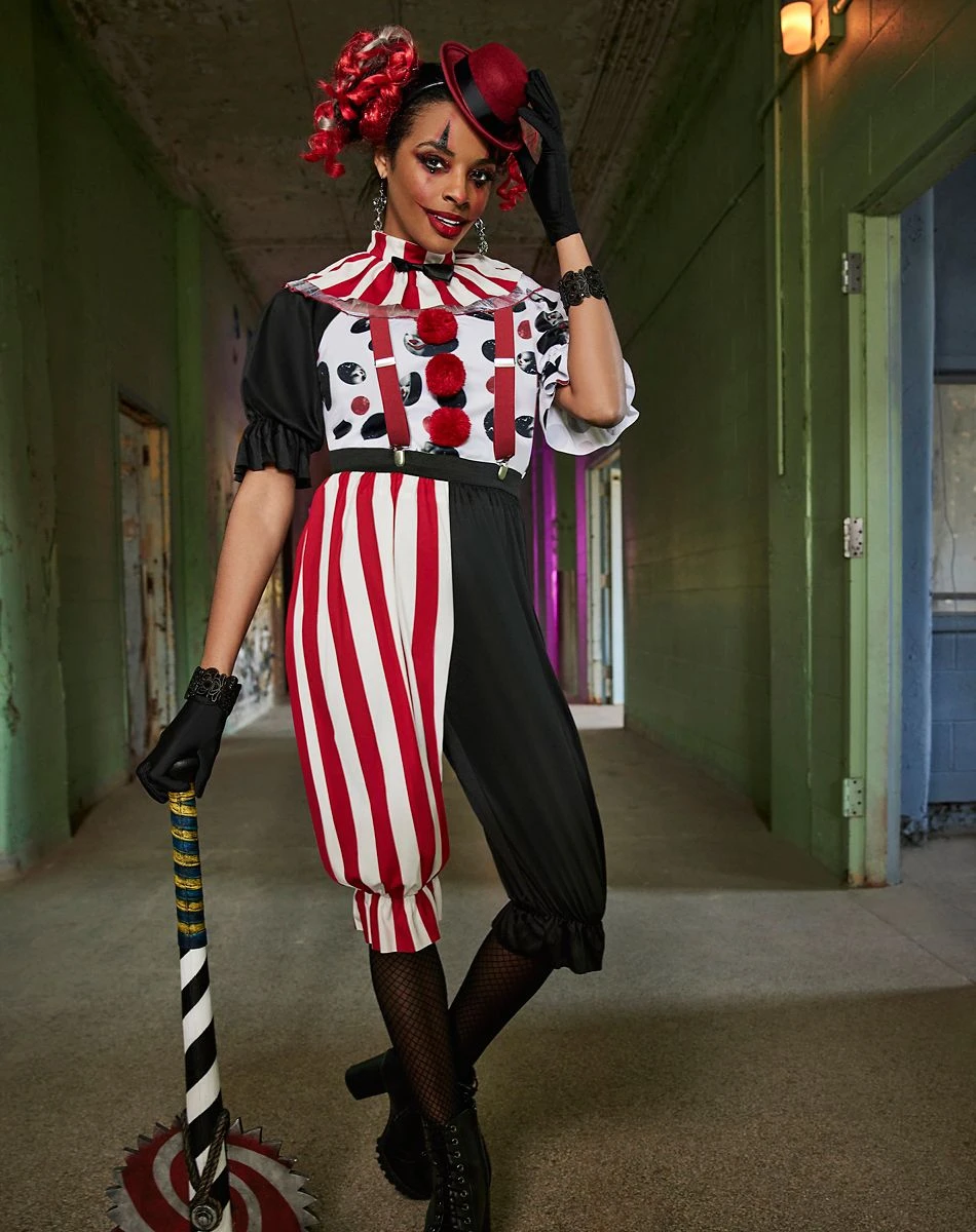 Don’t you just love clowns? This kreepy, krazy, plus size klown costume is a walking nightmare. With kooky striped pants, a polka-dotted shirt, a dramatic collar, red suspenders, and a tiny red hat, this clown is ready to wreak havoc on your circus.