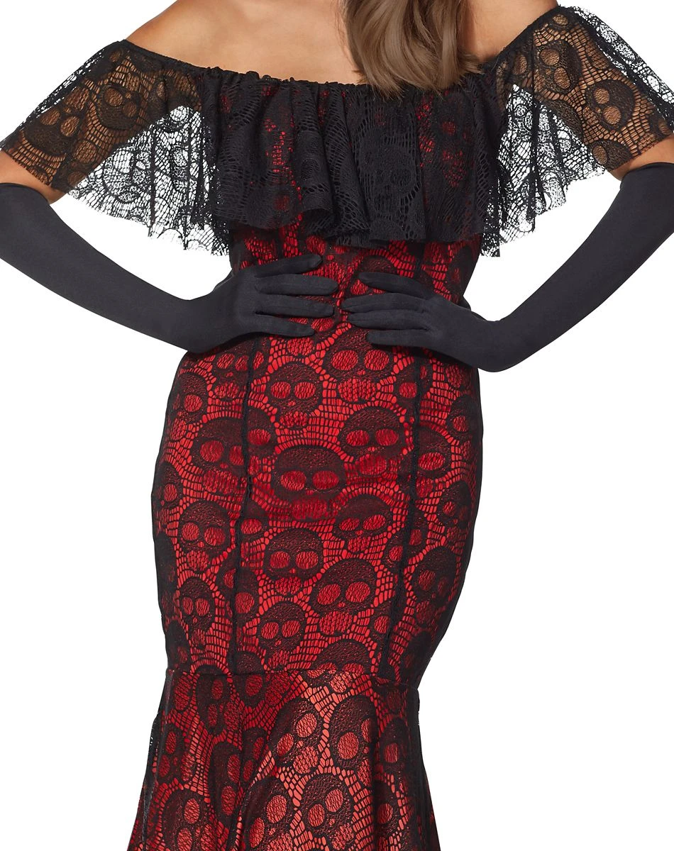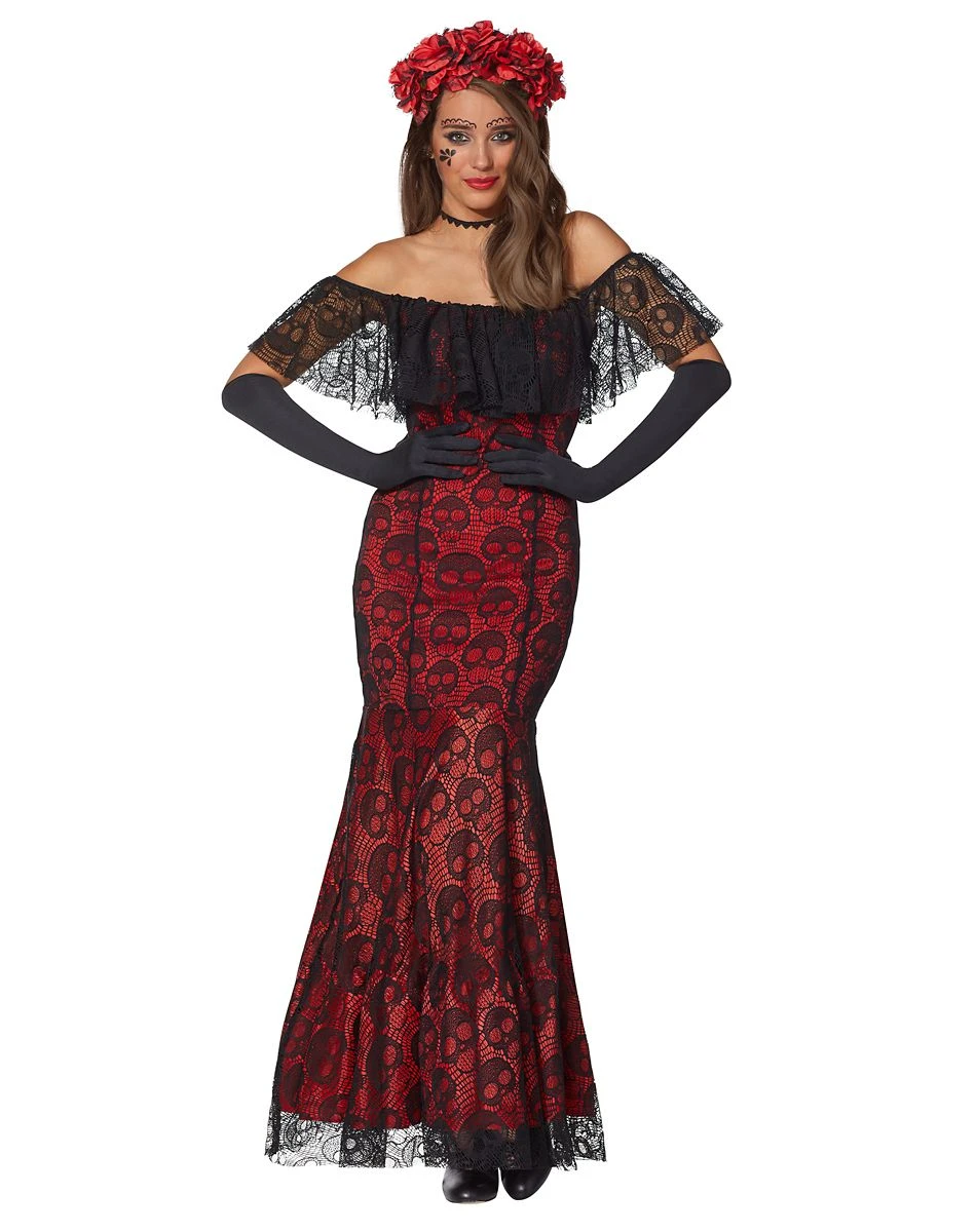 It’s time to celebrate with this festive Day of the Dead dress costume. Its beautifully put-together red and black design will have you dancing the night away! Â