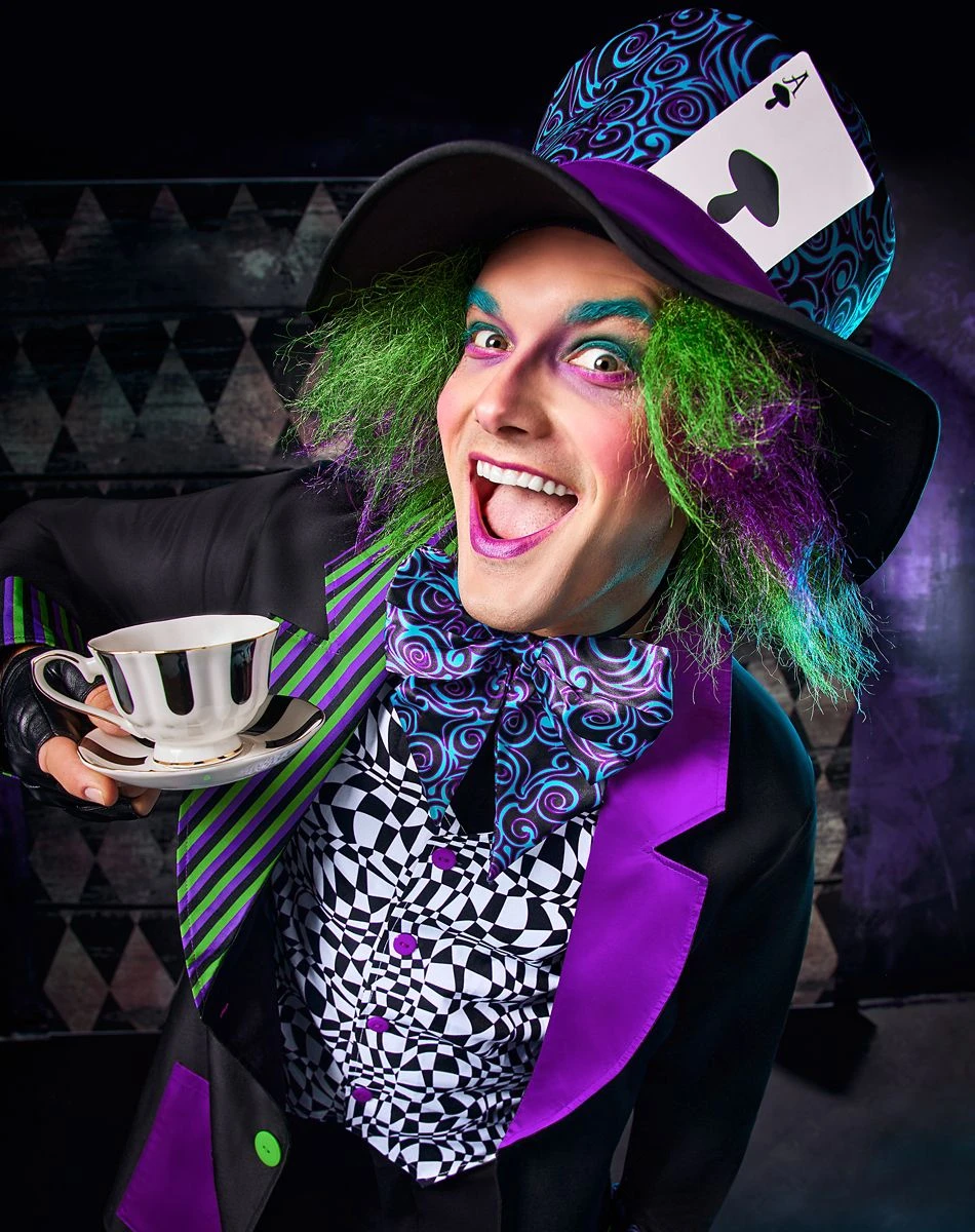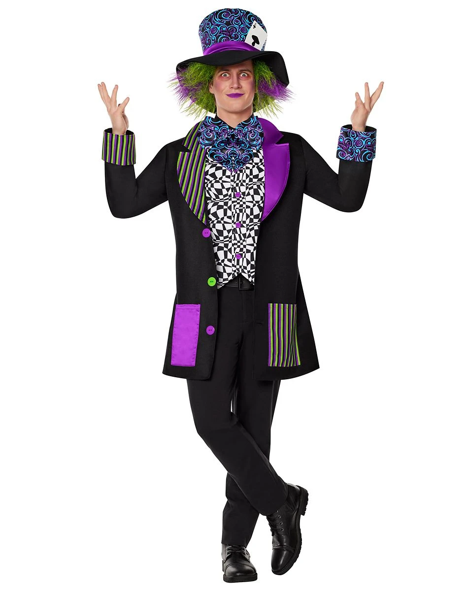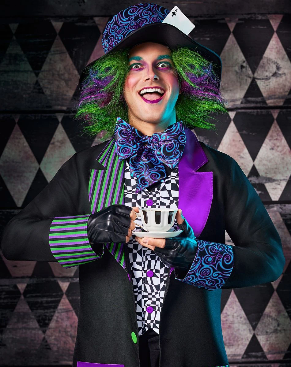 For a look that’s as wacky as they come, this Adult Twisted Mad Hatter Costume is a perfect choice. Featuring a black and white jacket and vest accented with purple and green detailing, a matching hat with an attached wig, and a bowtie, this colorful costume is sure to make you stand out in any room. Take on Halloween night in eye-catching style with this cuckoo costume!Â