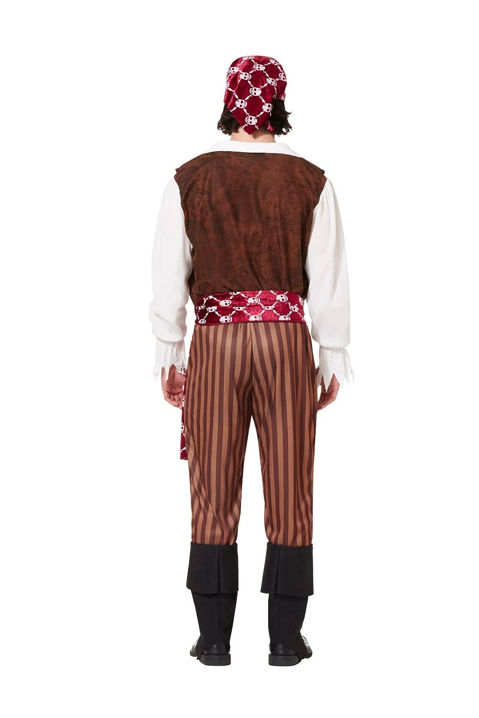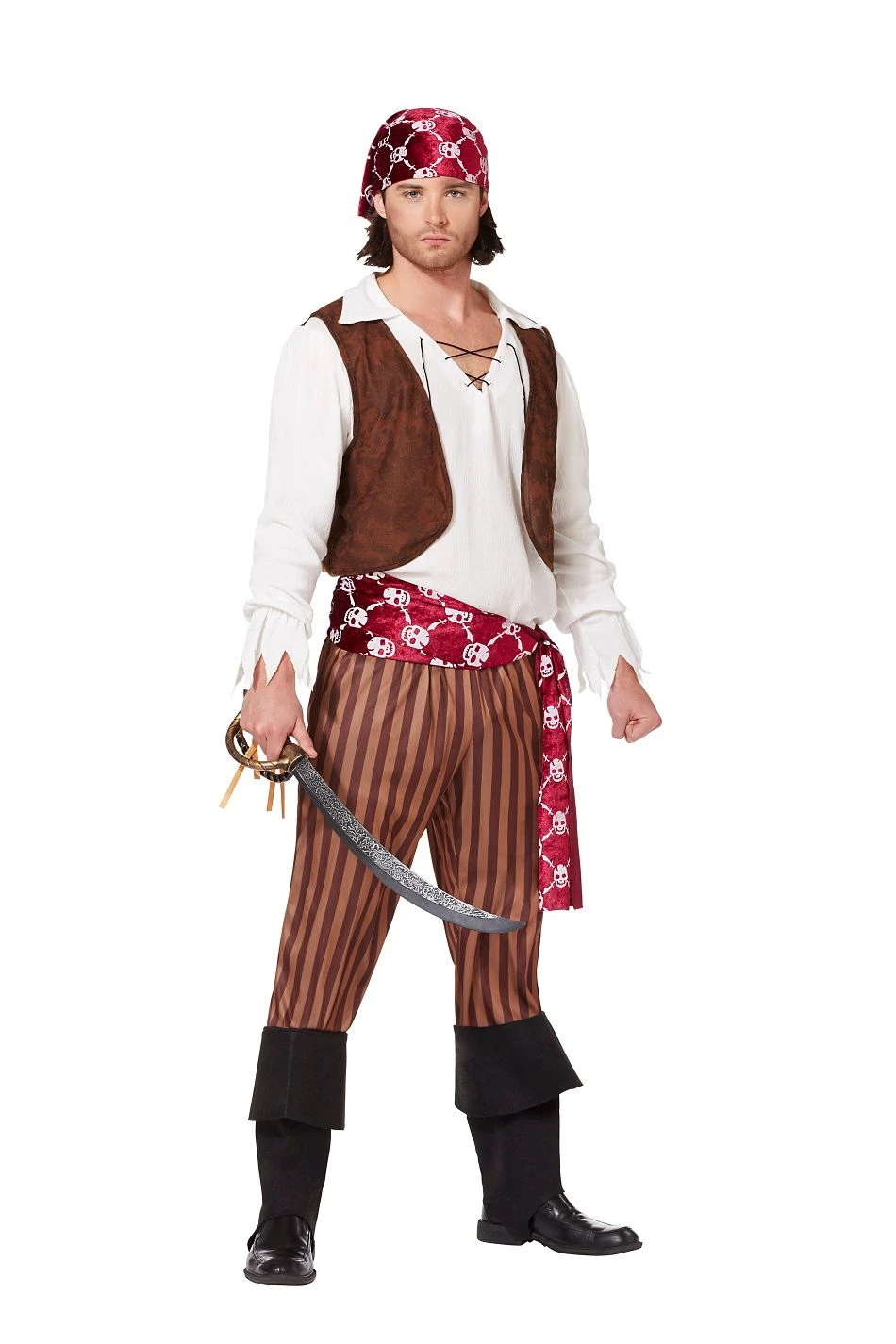 Climb aboard and set sail on Halloween when you dress in this Shipwreck Pirate Adult Mens Costume. Burgundy and white headscarf comes complete with pants, waist sash, shirt with attached vest and boot tops.