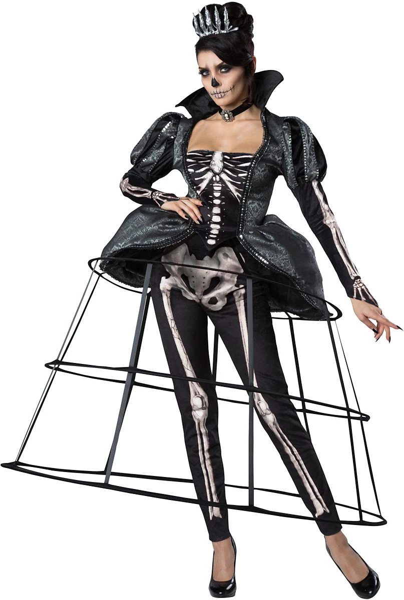 Become an elegant queen of the undead when you try on this adult skeleton queen costume this Halloween. This costume is fit for royalty and will have everyone bowing at their knees in your presence. Featuring a skeleton printed dress and leggings along with a skeleton crown and a black cage petticoat this costume will really make you look like the ruler of the skeleton kingdom. Reign supreme this Halloween when you wear this skeleton queen costume at your next party!