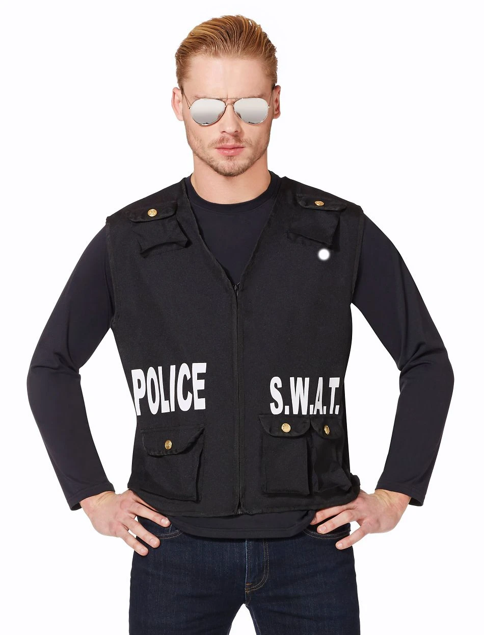 - The adult’s SWAT vest is made of black polyester with a zipper closure and white SWAT graphics. The vest has several pockets.