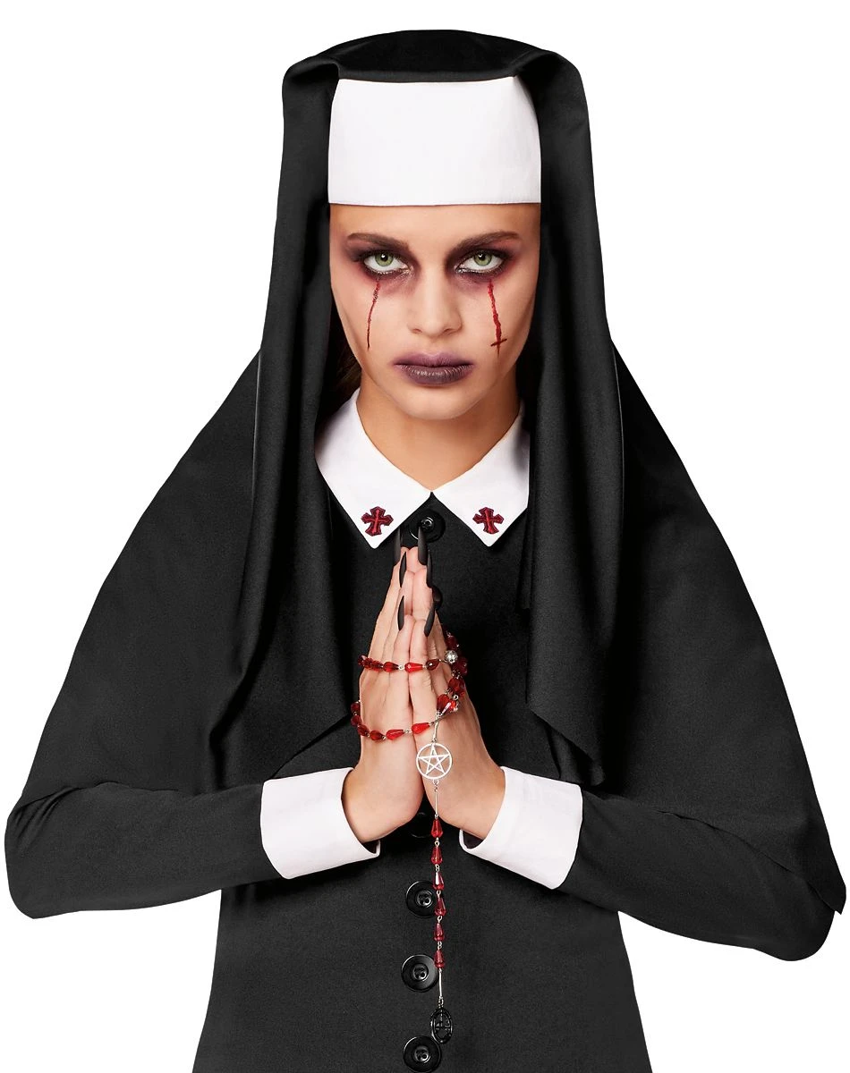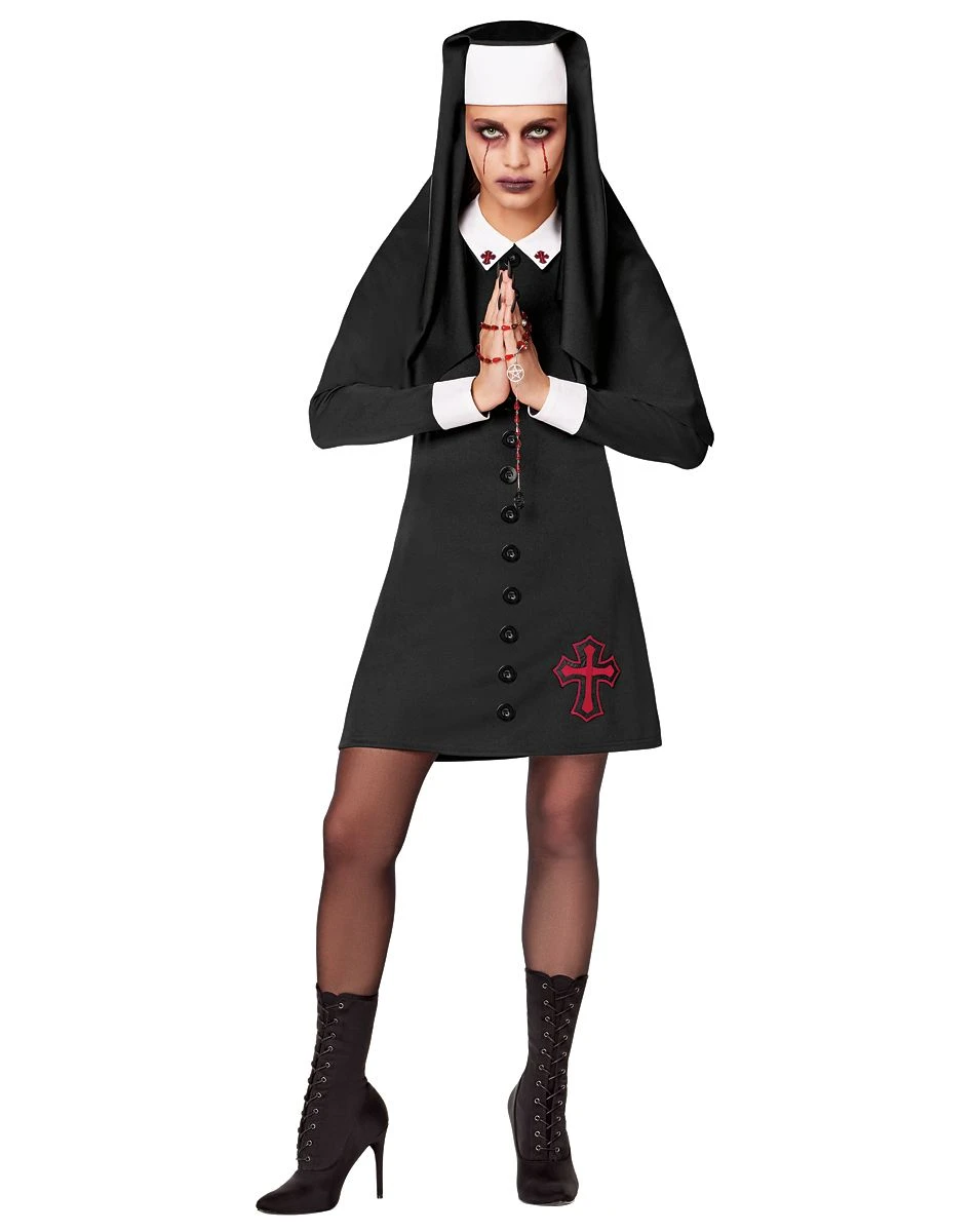 Make this Halloween unholy in this nun costume! This unholy nun costume includes a short black dress with long sleeves, decorative buttons, and cross accents on the collar and skirt. A black and white habit adds drama and authenticity to this dark look. Complete the sinister style with the included charm necklace.