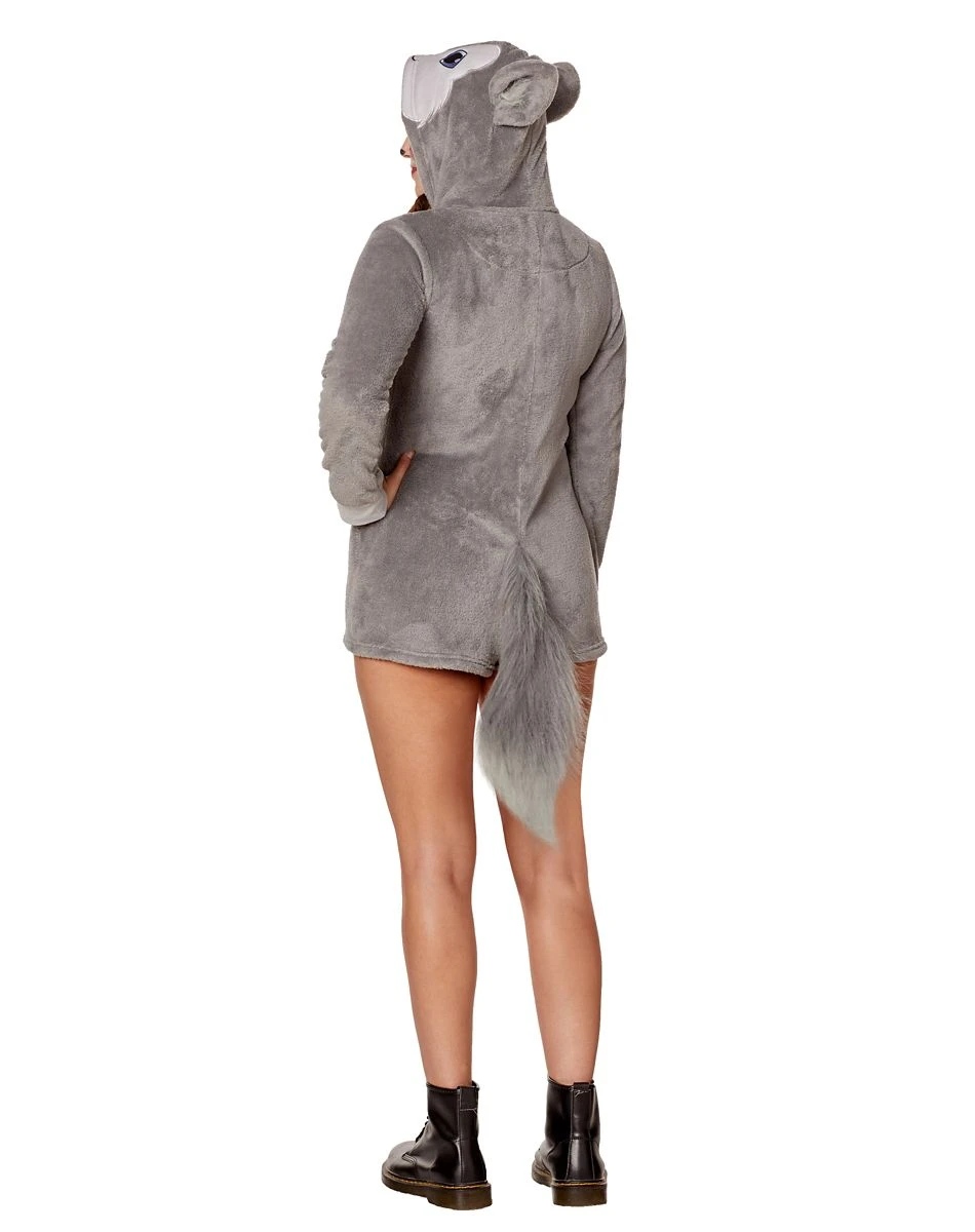 You’ll be howling with Halloween joy in this Adult Wolf Romper! Featuring a zip-up design with an attached wolf ear hood and fluffy tail, this gray plush romper is wildly cozy.