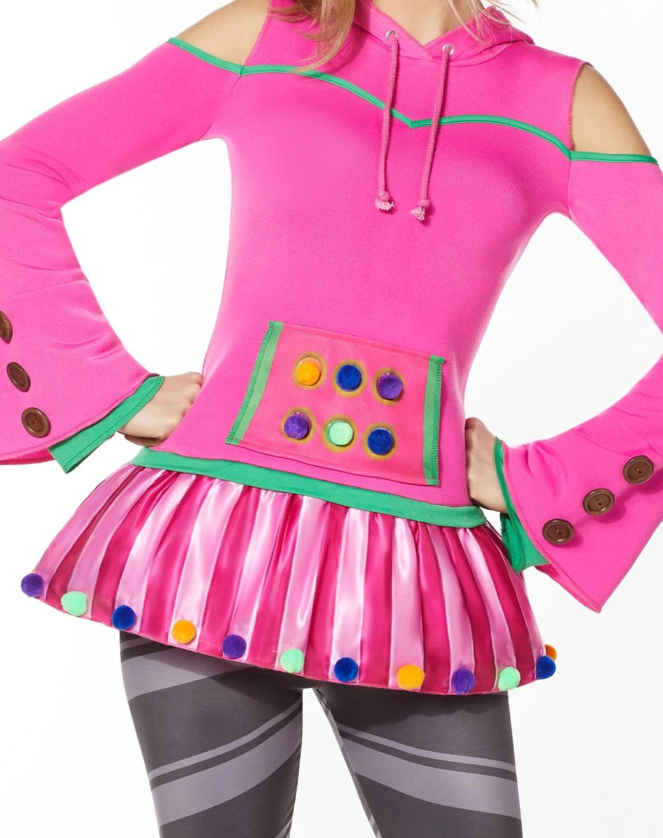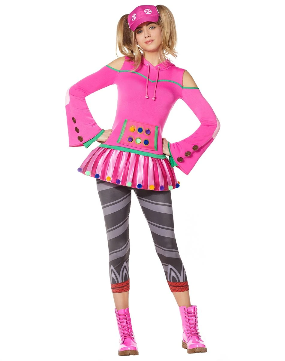 There’s no better time to cause some candy-coated chaos than on Halloween! You’ll be the perfect candidate to conjure up the chaos when you decide to become Zoey, the candy queen! This sweet outfit includes a pink hooded tunic, striped leggings, and a pink hat with peppermint decals. If you love candy and Fortnite, this costume is the perfect option for you to sport this Halloween.