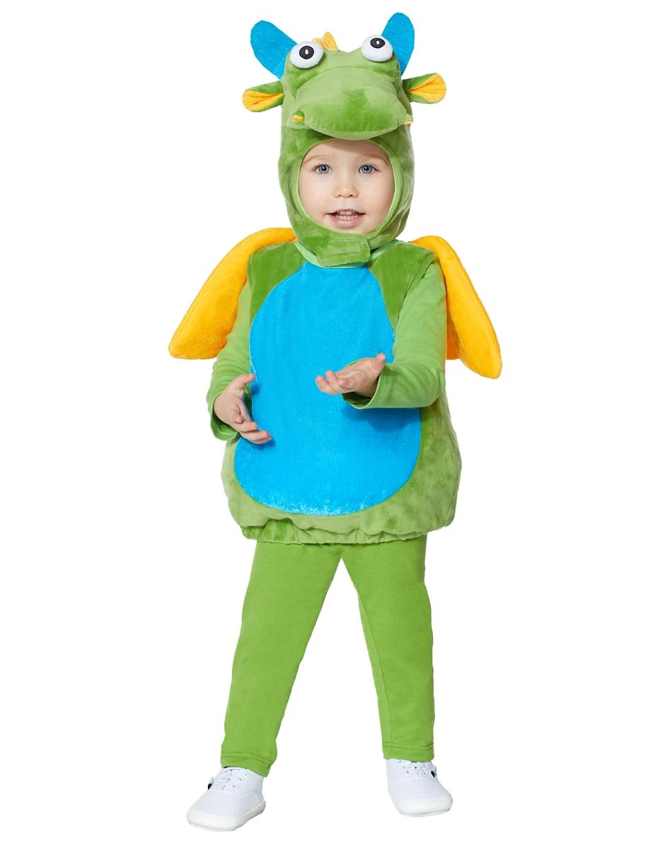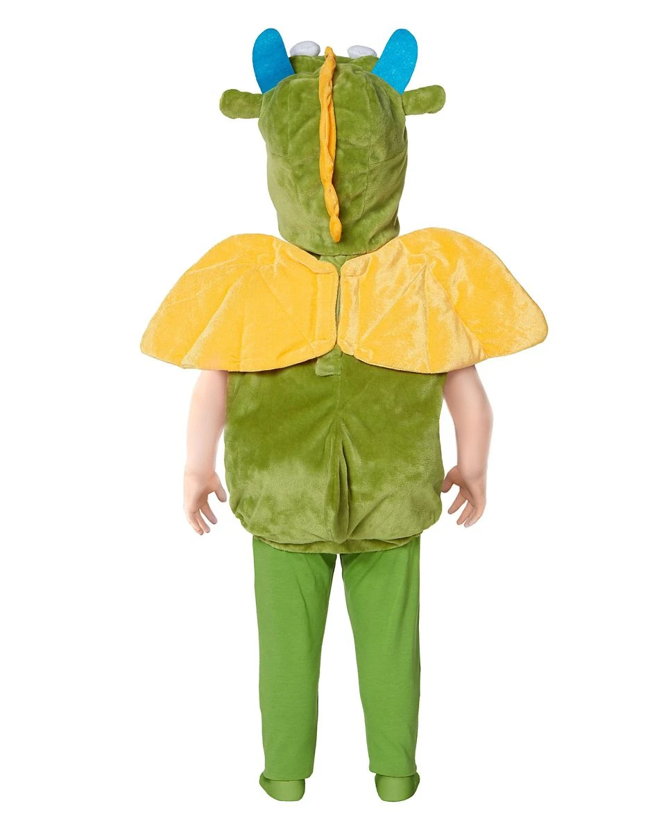 RAWR! Your little one will look adorably ferocious with this dragon costume! This warm and cozy costume features a soft green and blue body and flapping orange wings, and is topped with a matching dragon head; eyes, nose, ears, and all! With convenient Velcro closure, your little one will be rampaging through the streets in no time!
