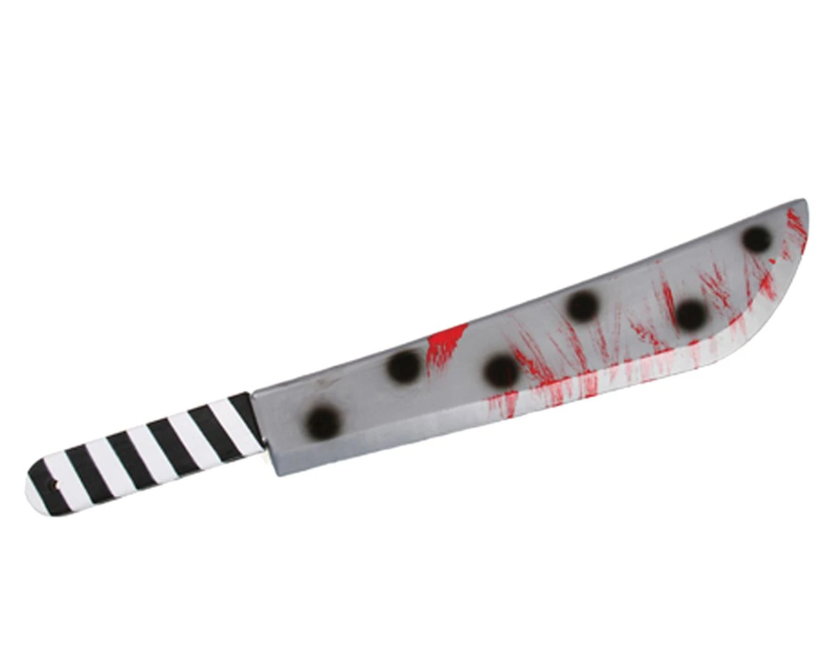 Bring fear to the room as you carry this Scary Clown Black and White Machete around the party! The sinister machete features blood on the polka dotted blade and a striped handle. When you carry this machete, everyone will know to laugh at your jokes…or else.