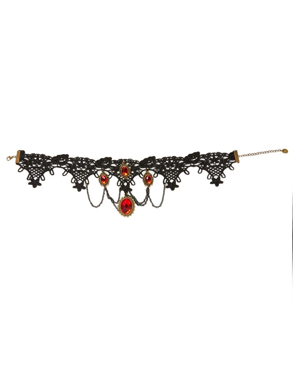 Be a vampire vixen with this lovely lace choker! The intricate black lace choker features swooping chains and elegant red rhinestones for a look that’s a welcome addition to any spooky ensemble this Halloween!