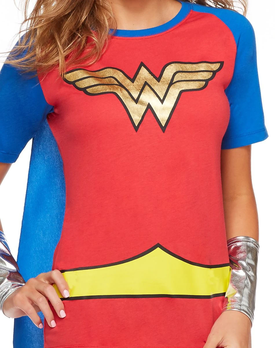 Save the day in style when you wear this officially licensed Wonder Woman Caped T-Shirt. The red tee features gold Wonder Woman emblem on the chest along with a yellow screen printed belt and blue bottom hem with white stars.