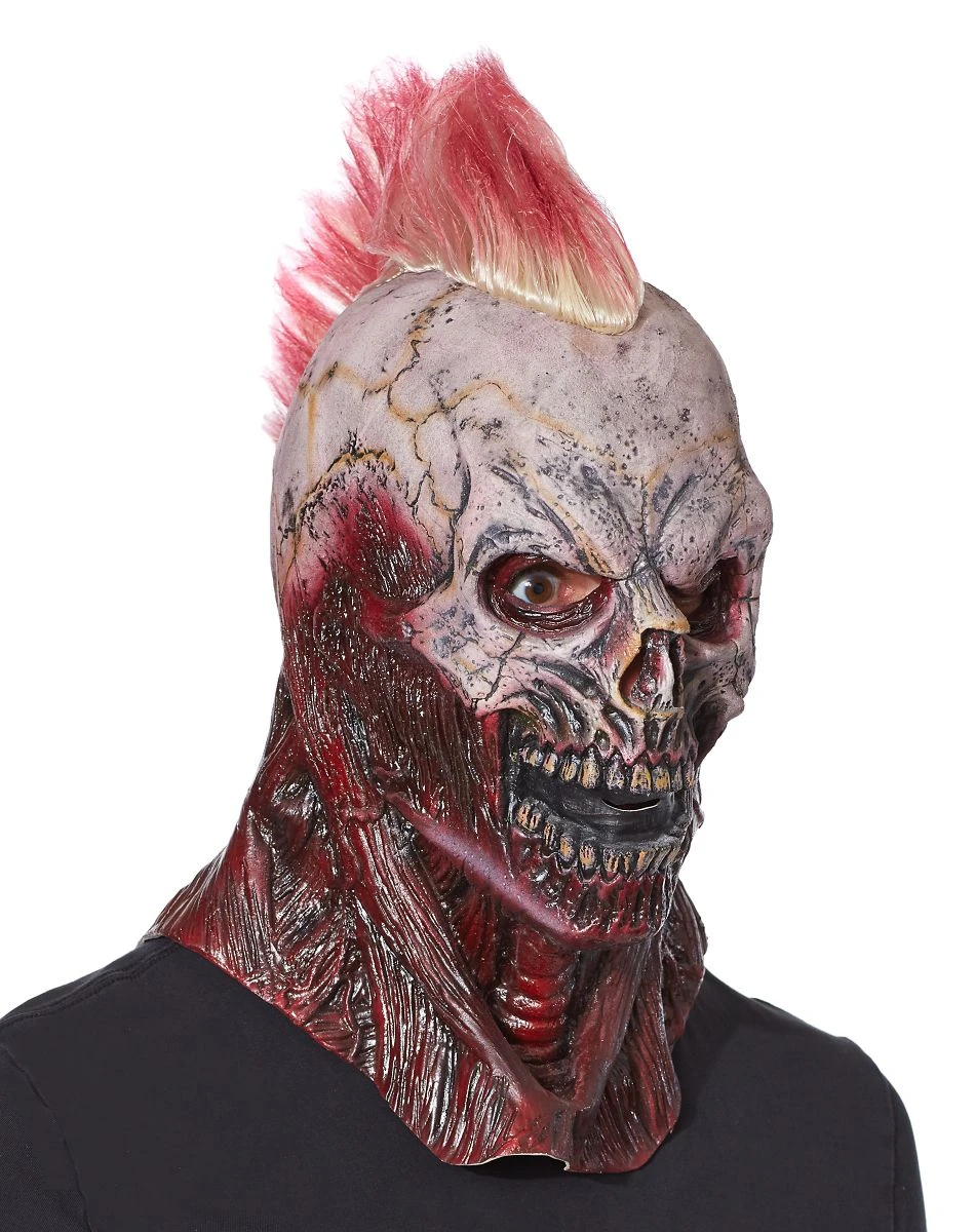 From the Tate Steinsiek Collection. Bring some edge to your Halloween with this punk skull mask! The bloody and bold mask features a bright red mowhawk and exposed muscle details that will leave everyone running scared!