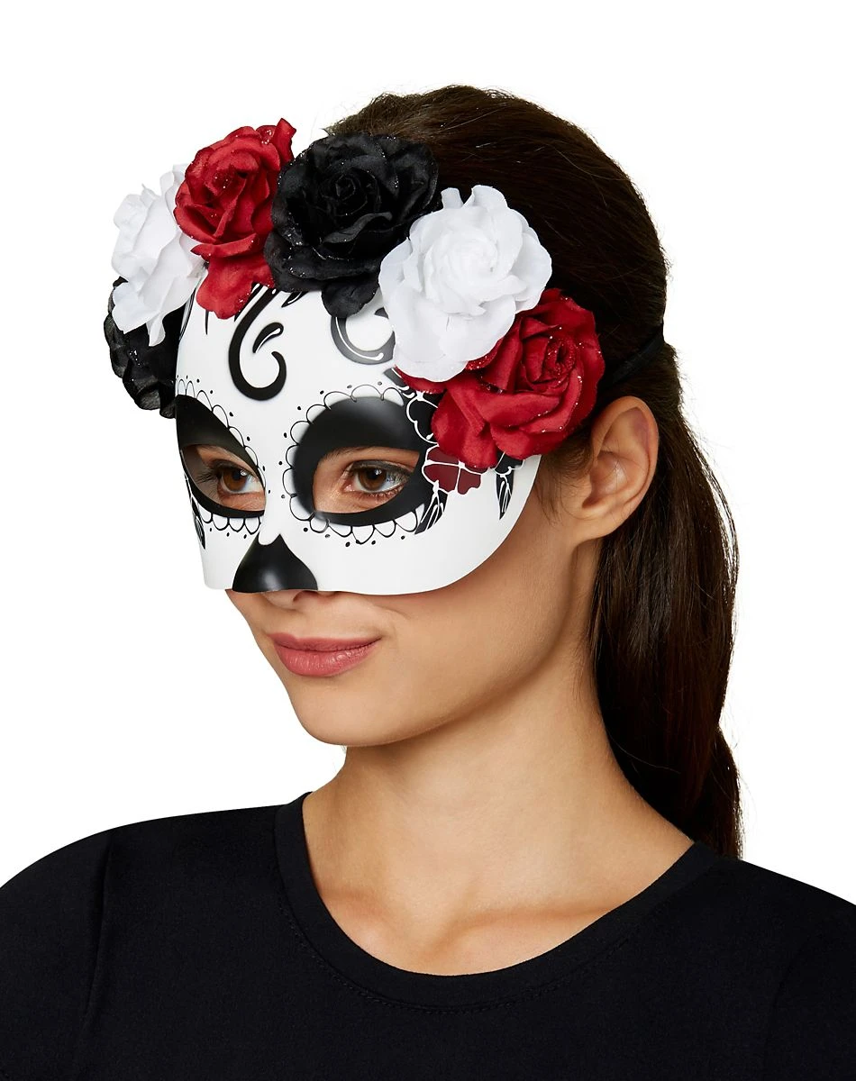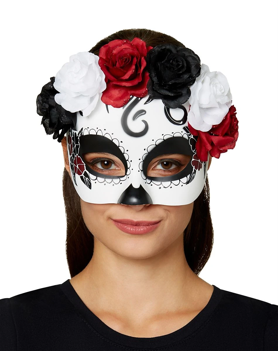 Honor your loved ones this Halloween by celebrating Day of the Dead this year with this Day of the Dead roses half mask. This stylish mask features a decorated skeleton face, with a crown made of roses and will have you looking just like a Day of the Dead skeleton.