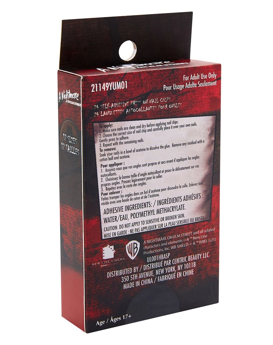 Show off your favorite horror movie with these official A Nightmare on Elm Street Freddy Krueger press on nails! These faux nails feature Freddy Krueger as well as his familiar colors. They’re perfect to go with your horror costume (sold separately) or just to add some fun to your fingertips.