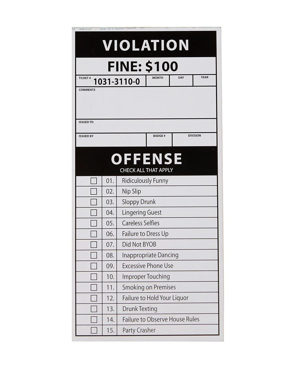 Oh geez, who called the party police? Write up any Halloween offenses like Failure to Dress Up, Party Crashing, and Careless selfies with this hilarious ticket pad. Makes the perfect piece for your cop costume!