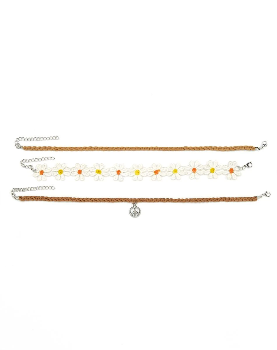 Get ready to embrace a hippie style with this Daisy Fabric Choker Set! The set includes three chokers: a navy braided one, a thing tan braided one, and one make up of white daises with a silver peace sign hanging off it! Go back to the 70’s and let everyone know that you love nature and peace with these necklaces!