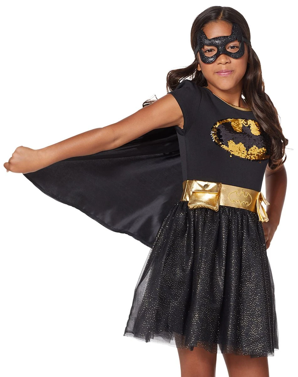 Your little girl will love dressing up as her favorite superhero this Halloween! She’ll be ready to fight crime (or just ask for candy) in this kids Batgirl dress costume. The velcro, detachable cape will fly in the wind as she’s running around and stashing some extra candy in the attached belt with real snap-closure pockets! She’ll also love playing around with the reversible sequined Batgirl logo.