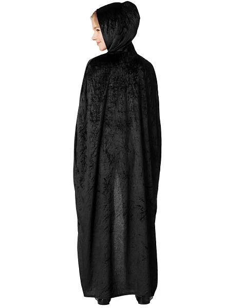 Conceal your identity in the luxe Black Velvet Hooded Cape Child Costume. This velvet black cape skims the ground and has a hood that adds an air of mystery.