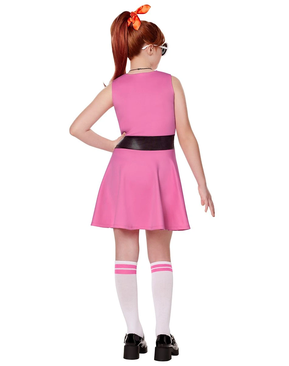Gear up for action in this kids’ Blossom costume! Become a member of the ultimate girl squad, the Powerpuff Girls, when you slip into this pink dress complete with an attached black belt and a blossom graphic! Complete the look with Blossom’s signature hair accessory, a pair of wide-eyed sunglasses, a necklace adorned with Blossom’s name, and a pair of pink and white knee-high tights.