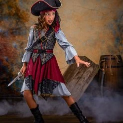 From our exclusive Signature Collection. Ahoy, Matey! This adorable pirate costume will have your little one sailing the seven seas in no time at all! The gorgeous dress with tiered skirt features rich tones and black lace that will have your child standing out in every crowd. With off the shoulder peasant sleeves and a matching brocade flocked print vest, there’s no storm your little girl can’t handle. Add the included faux suede headwrap and pirate hat with distressed leather trim for a look that will be all her own! The included dagger will have them ready to plunder any ship!