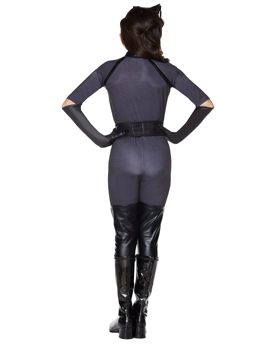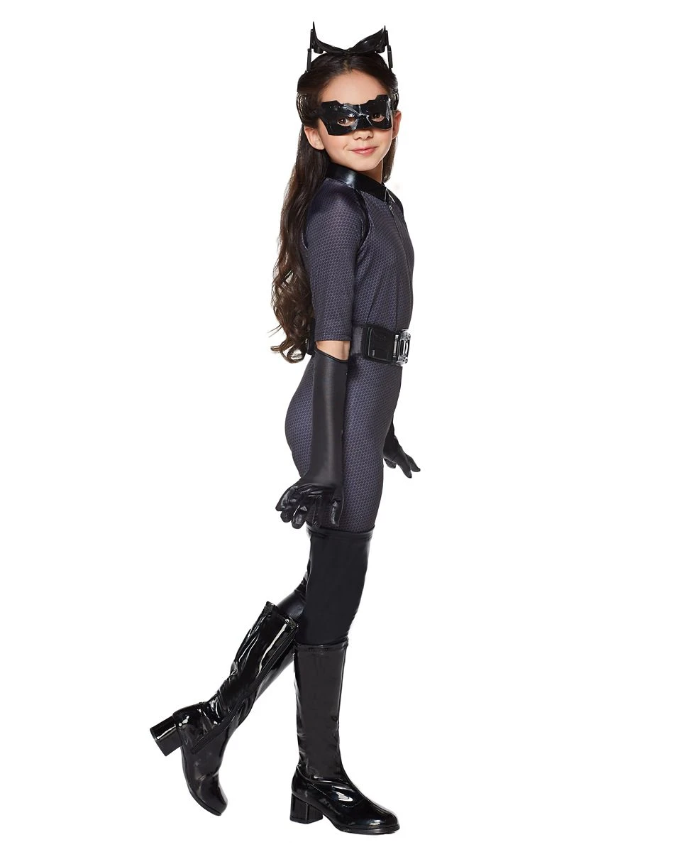 Stir things up on Halloween when you prowl the streets in this officially licensed Batman Dark Knight Catwoman Deluxe Girls Costume. Slink through Gotham as the mysterious Selina Kyle in the all-black jumpsuit. Make sure your look is undercover so Batman never finds you out with the included eyemask and molded belt. You’ll be able to sneak all the best candy in this Catwoman costume!