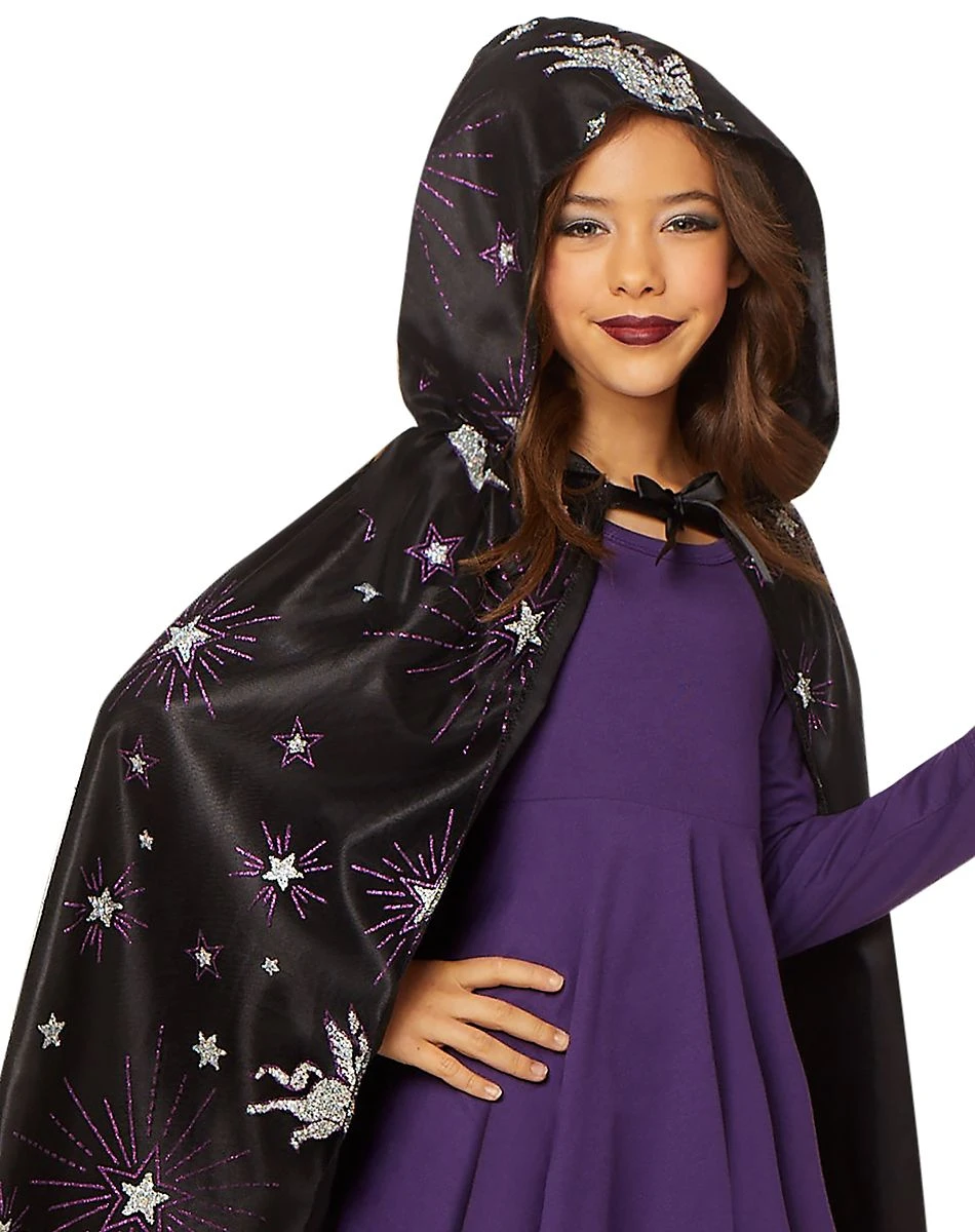Your little one will be ready to cast a spell in no time at all when they slip into this beautiful celestial cape! Covered in purple and silver glitter detail, your pride and joy will shine all Halloween long! The attached hood and tie closure will bring every look alive!