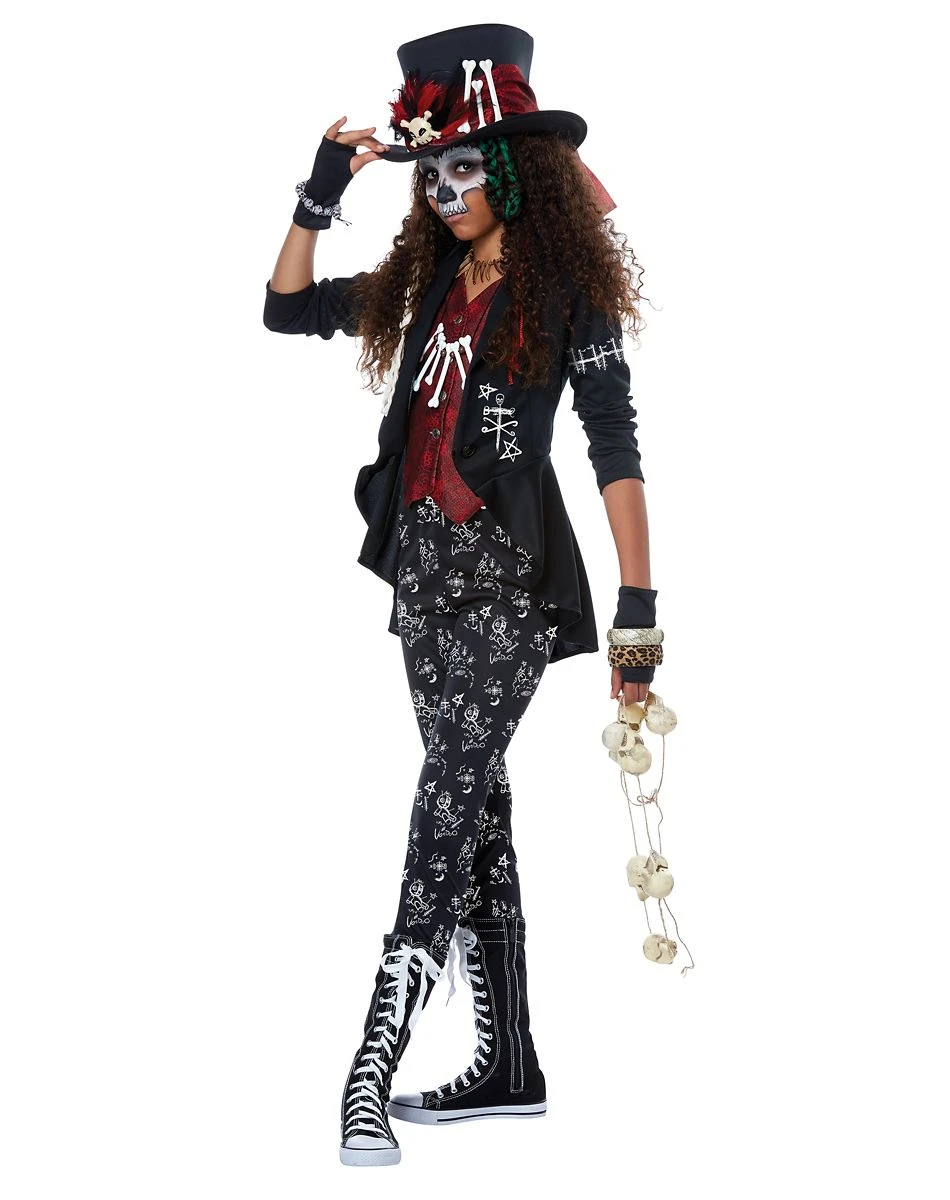 Show off your spiritual side with this adorable voodoo princess costume. The jacket with attached vest goes perfectly with the printed leggings. Add the finger-less gloves, bone necklace and decorate top hat, and you’ll be ready for a night of voodoo! The perfect costume to scare away the rest of the trick-or-treaters, so you can get all the candy!