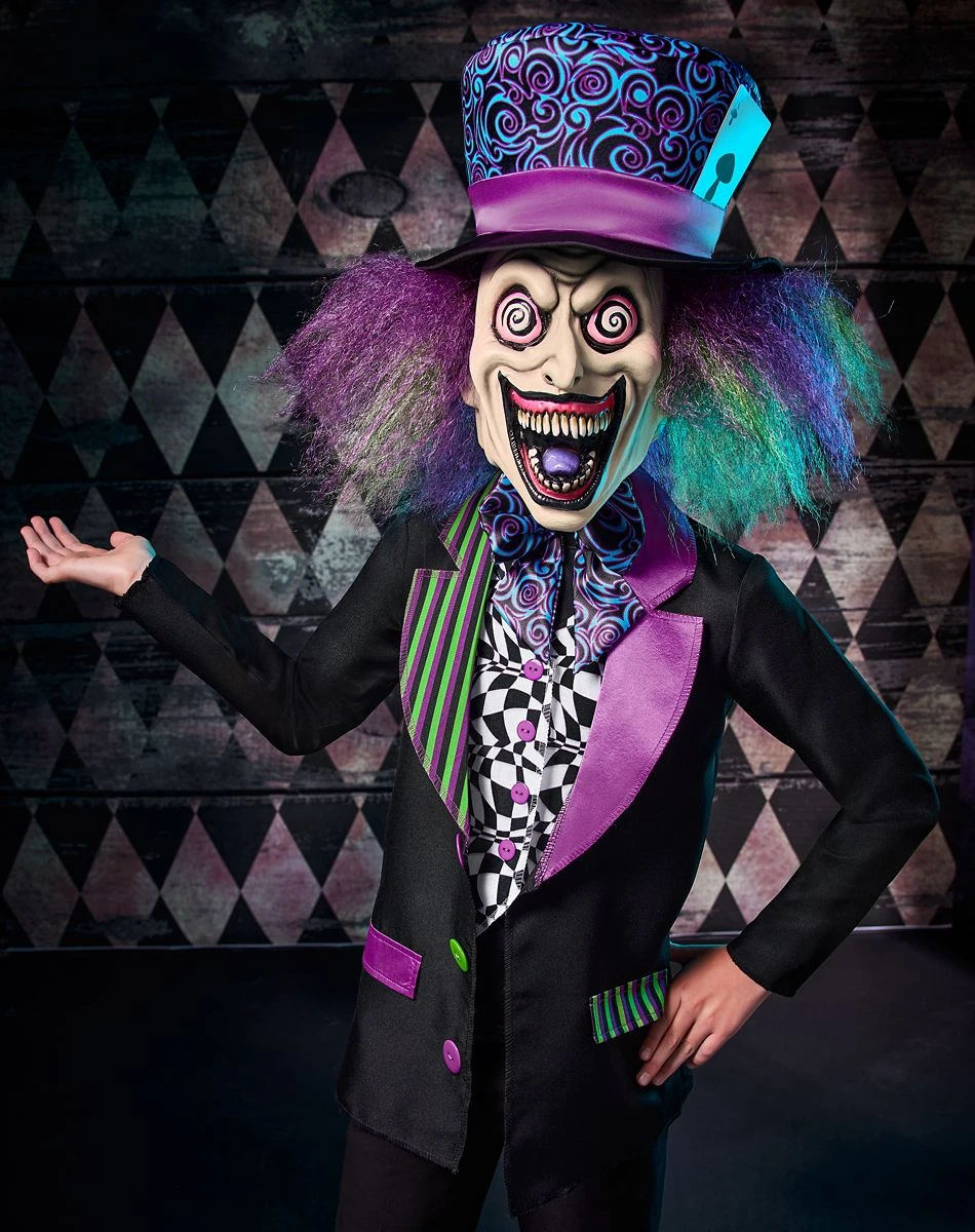 You’ll be entirely bonkers in this Dark Mad Hatter costume. A crisp black suit jacket with an attached vest and neon accents looks put-together and positively mad! An oversized bow tie and hat feature vibrant, surreal colors. A petrifying mask with swirling eyes and a gaping grin completes the look.
