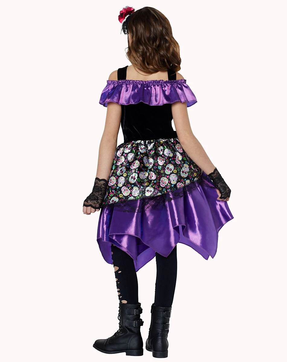 Let your little one celebrate Day of the Dead on Halloween with this beautiful Day of the Dead dress costume! The colorful sugar skull detail, velvet material, and off the shoulder sleeves are perfect for every little girl! Lace detail matches the included gloves and headband for a put together look that is unlike the rest!