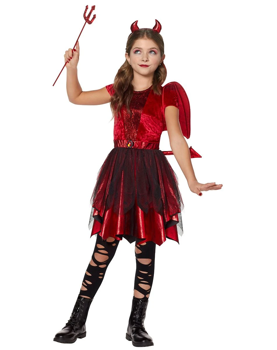 Let your little get a little devilishly daring when she wears this adorable devil costume this Halloween! This velvet dress with metallic detail features fishnet assets that will have her standing out among the rest! The attached tail adds a little extra style! This is the perfect costume for that little devil of the family.