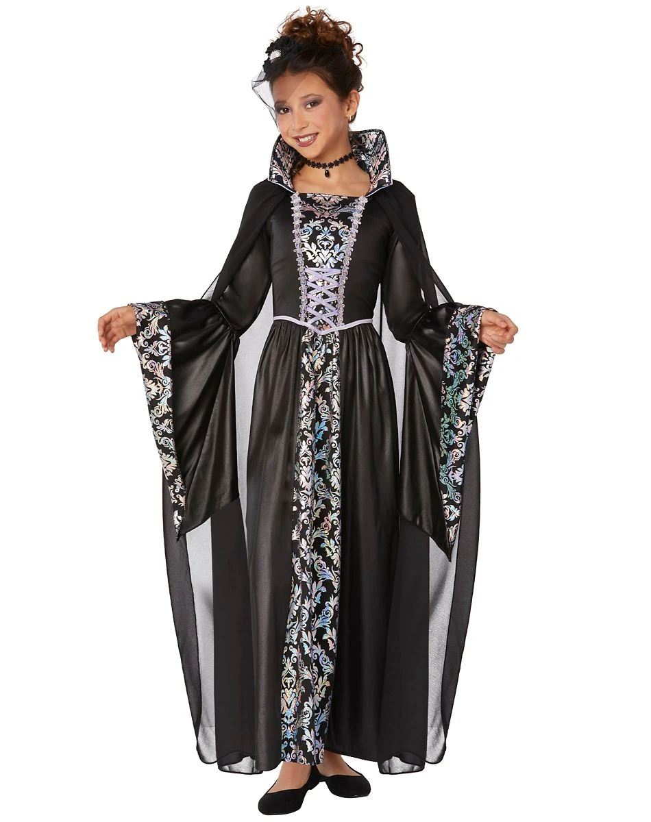 This beautiful Divine Vampiress Costume will have your little one looking like the ultimate queen of darkness this Halloween! This incredible costume includes a long sleeved black dress with an attached cape and a hair accessory that will bring the vampire look together perfectly.