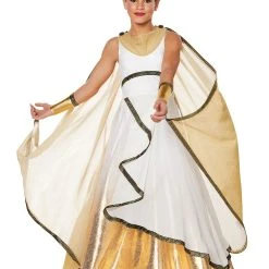 From Our Exclusive Signature Collection. Turn your child into the royalty that they are with this golden goddess costume. Covered in glitter and gold foil crackle-printed mesh details, there’s no doubt she’ll shine on Halloween night. This layered dress features a ruffled bodice, Grecian box motif trim, and a sheer metallic cape fit for a goddess! Add the included metallic gold faux leather wrist gauntlets and deluxe metal leaf headband for a look that will stun the town!