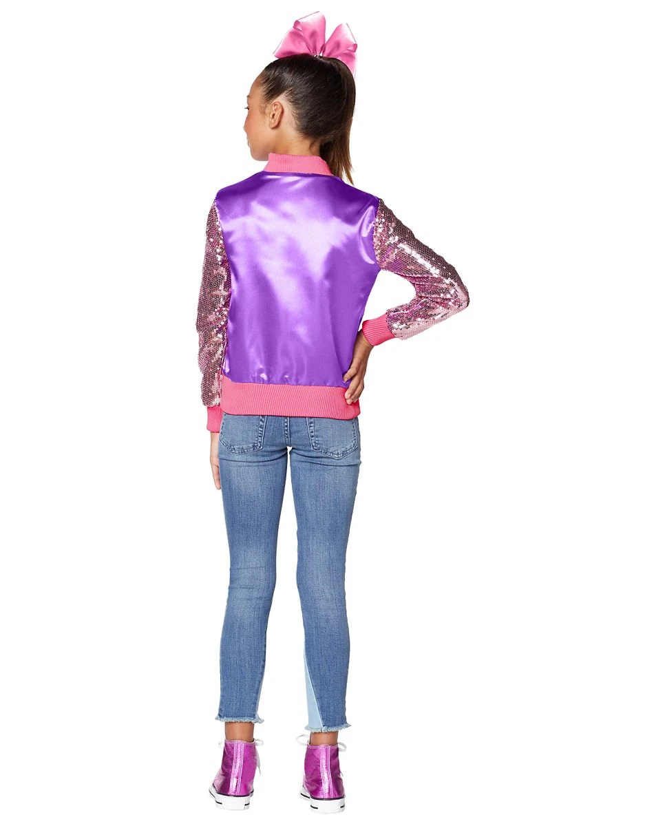 Take on the night in JoJo Siwa style with this officially licensed JoJo Siwa bomber jacket! This colorful jacket features vibrant purple and pink detailing, pink sequin sleeves, and stylized heart, unicorn, and cupcake patches. You’ll look sweet and stylish when you slip on this cute piece!