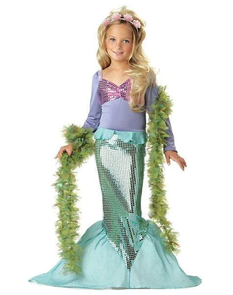 - The Lil’ Mermaid child costume is a pastel green and lavender 100% polyester dress with unique fabric detailing that simulates the fins and sparkling sheen of a mermaid’s scales. The costume is completed with an aquatic inspired head band.Â
