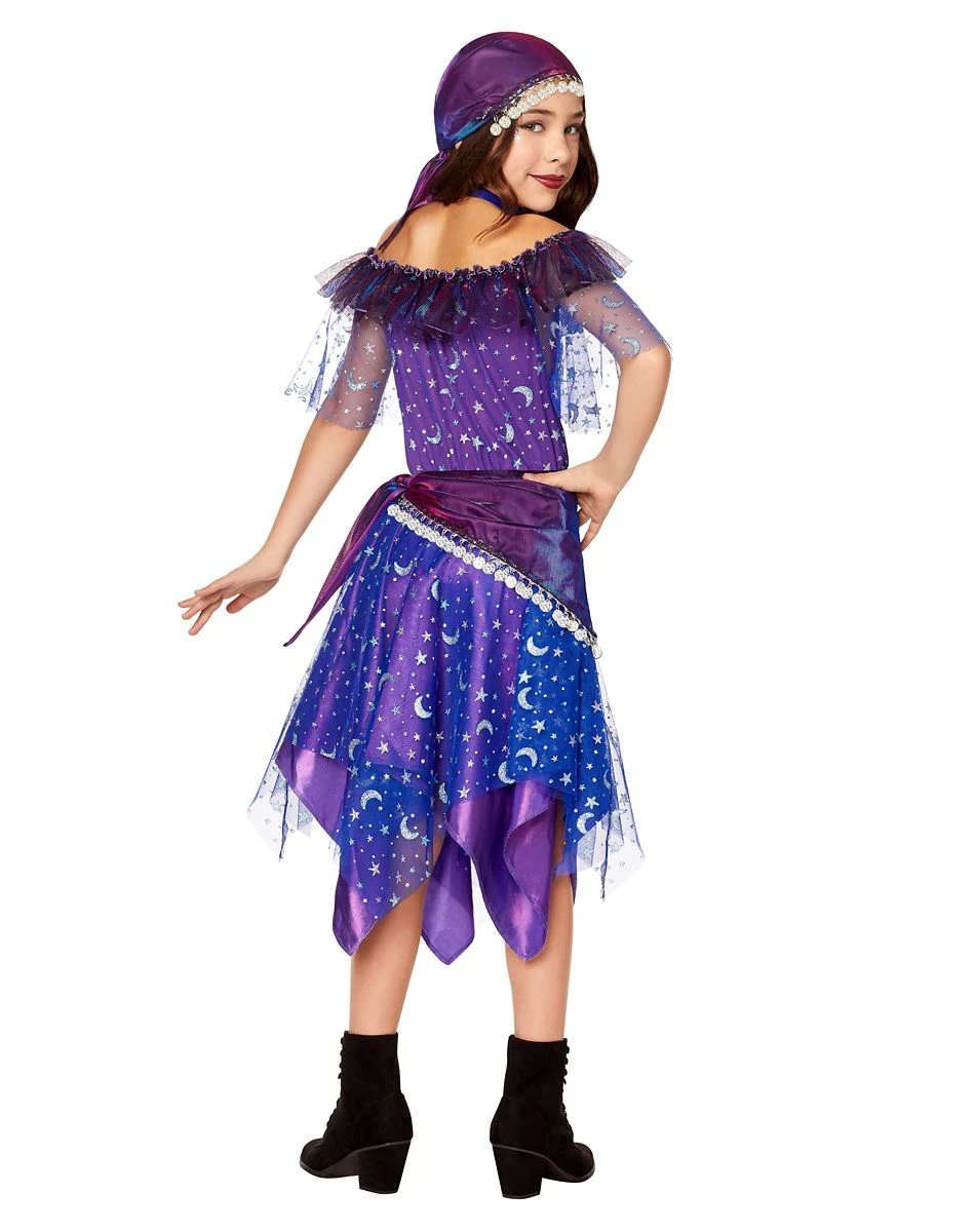 Let your fortunes come alive! This adorable fortune teller costume is the perfect costume for your little one on Halloween night. Covered in a moon and star glitter pattern, this dress features iridescent fabric with mesh overlay, a cinched waist for the perfect fit, an elastic neckline for multiple wear options, and a sharkbite hem for a fashion-forward look. Add the included head scarf, sash and choker for a look that is sure to win every Halloween costume contest.