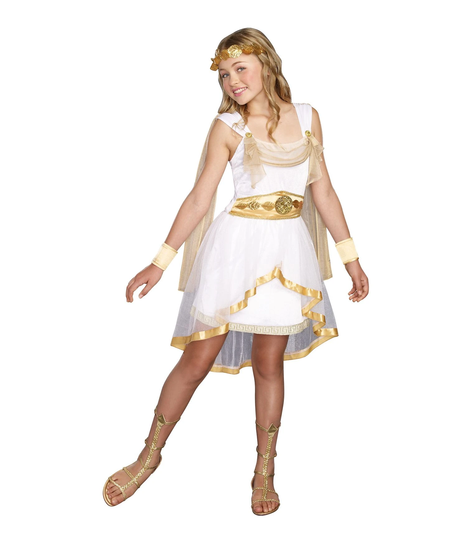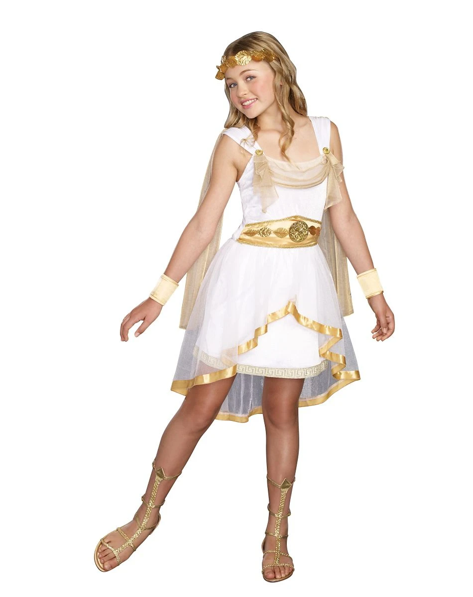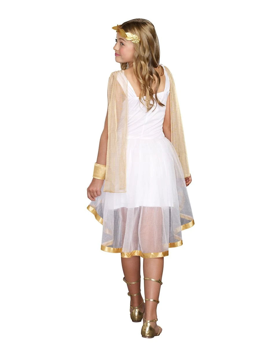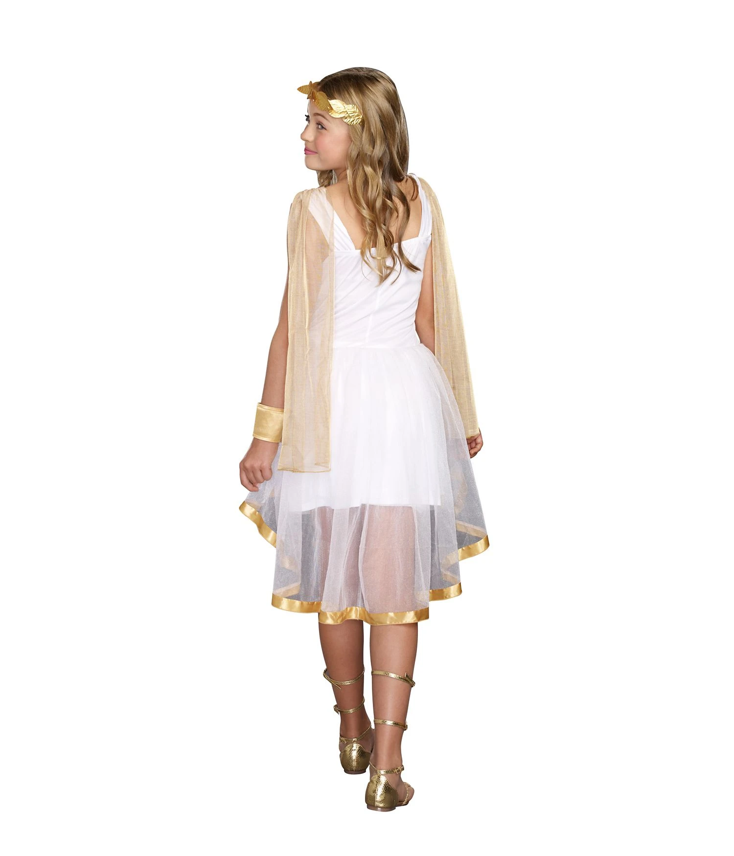 Coat yourself in riches while wearing this Miss Olympian Girl’s Costume! Rule over Olympia with this short tank dress overlaid with beautiful white tulle around the skirt lined by gold accents and featuring drapery along the neckline. The dress reaches mid-thigh with an attached gold cape and strong belt around the waist. Bring out your Greek goddess with the golden laurel headpiece fit for a true beauty and matching Olympian wrist cuffs. All you need are a pair of wrap sandals (sold separately) and your costume will be complete!
