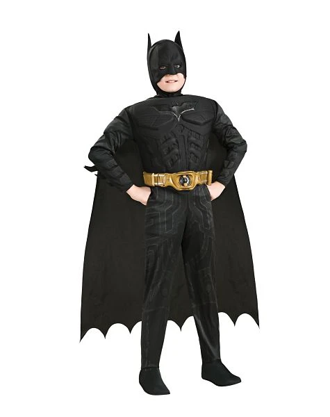 Protect Gotham City when you wear this officially licensed Batman The Dark Knight muscle chest child costume. The black, highly detailed screen printed jumpsuit of this Batman costume comes complete with gauntlet arms and attached boot tops along with character headpiece and cape.