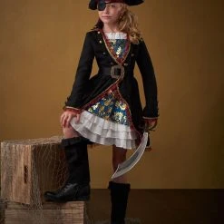 From Our Exclusive Signature Collection. Arrrgh! Storm the seven seas and go on thrilling adventures in this deluxe kids pirate costume! This costume features a vibrant teal dress complete with metallic gold brocade-printed velour atop organza ruffle and ornate trim. The belted, black and gold suede-like jacket is adorned with a pirate ship icon printed in distressed metallic on the back. Accessories are included to ensure that your young pirate has everything they need to set sail!