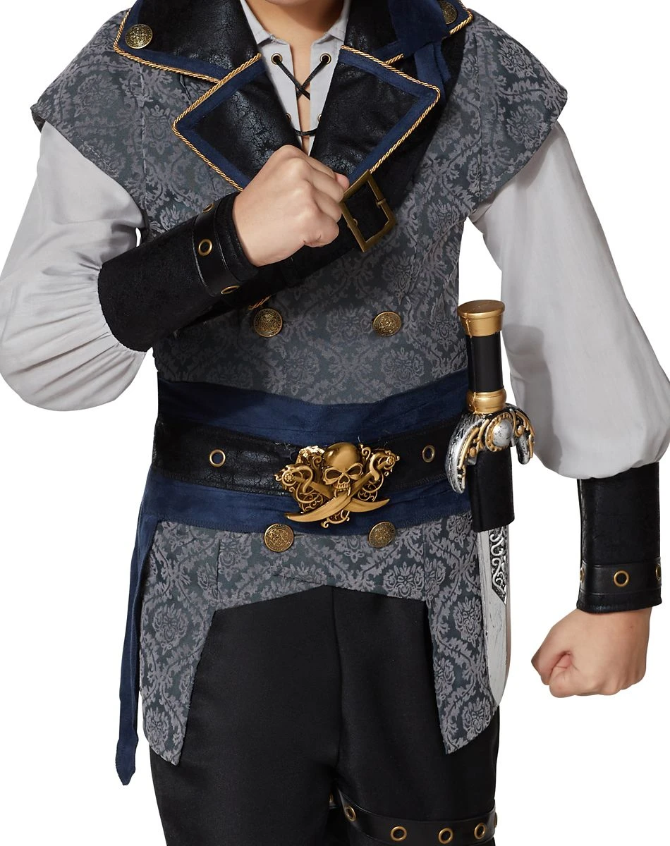 From Our Exclusive Signature Collection. Argh, matey! Let your little one sail the seven seas this Halloween when you dress them up in this stylish Pirate costume! Your little one will be ready to take on any storm that rolls in, but we know the wind will be in their favor on Halloween night. Coming complete with pants, a tie-up shirt, a detailed and textured vest, a removable belt, a sword and, of course, an eye patch, your little one will be the most authentic pirate in town! Top it all off with the included matching hat and it’ll be time to sail.