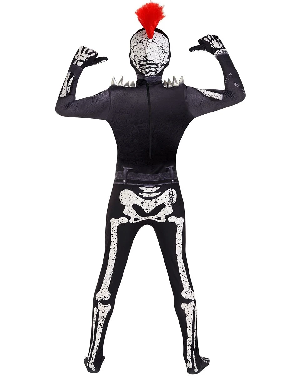 Rock on this Halloween in skeletal style with this Punk Skeleton Skinsuit. With this skinsuit on everyone will know you like to party hard and you’ll be looking like a skeleton stud! This skin suit features a skeleton pattern on it with an attached red mohawk wig that’s sure to have you looking ready to rock!Â