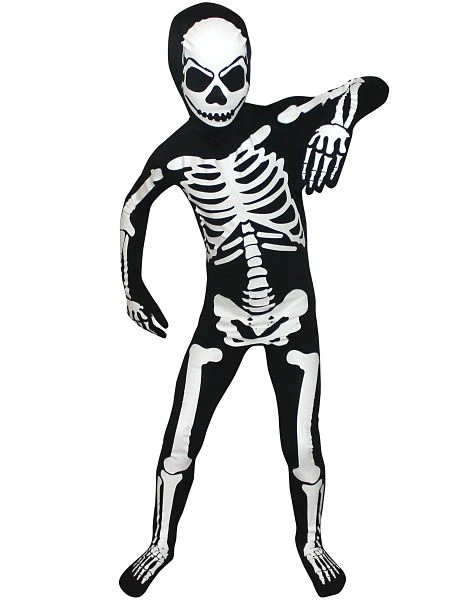 Let your youngster be a creepy bag of bones on Halloween when they wear the Skeleton Child Skin Suit. This black and white skin suit features skeleton graphics and a double zipper with reinforced stitching. This awesome costumes is also breathable and see-through.