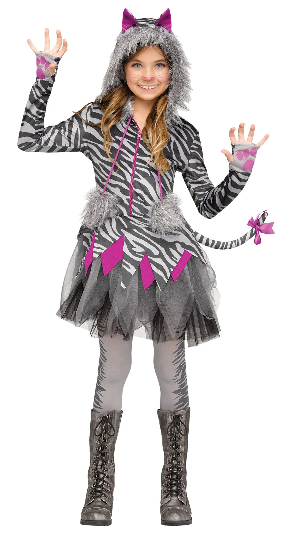 Let out your wild side and prepare to pounce with this eccentric smitten mitten costume. Make a statement with this funky feline costume that includes a zebra print hooded dress with cat ears and a tail, along with some footless tights for an easy transformation. You’ll be the cutest kitty around when you choose to go with this costume for Halloween!