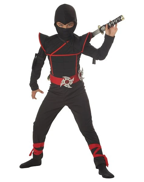 Take to the shadows on Halloween when you wear this Stealth Ninja child costume and practice your killer moves. The black and red, 100% polyester jumpsuit of this ninja costume features attached ties and comes complete with a red belt, black hood and a face mask.