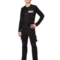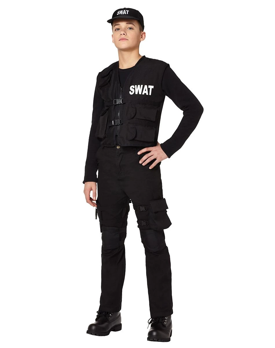 Take command on Halloween when you use this SWAT boys costume kit! It has everything you need to take down all the bad guys, including a black vest, hat,knee pads, holster and pouch. Be prepared for chaos!